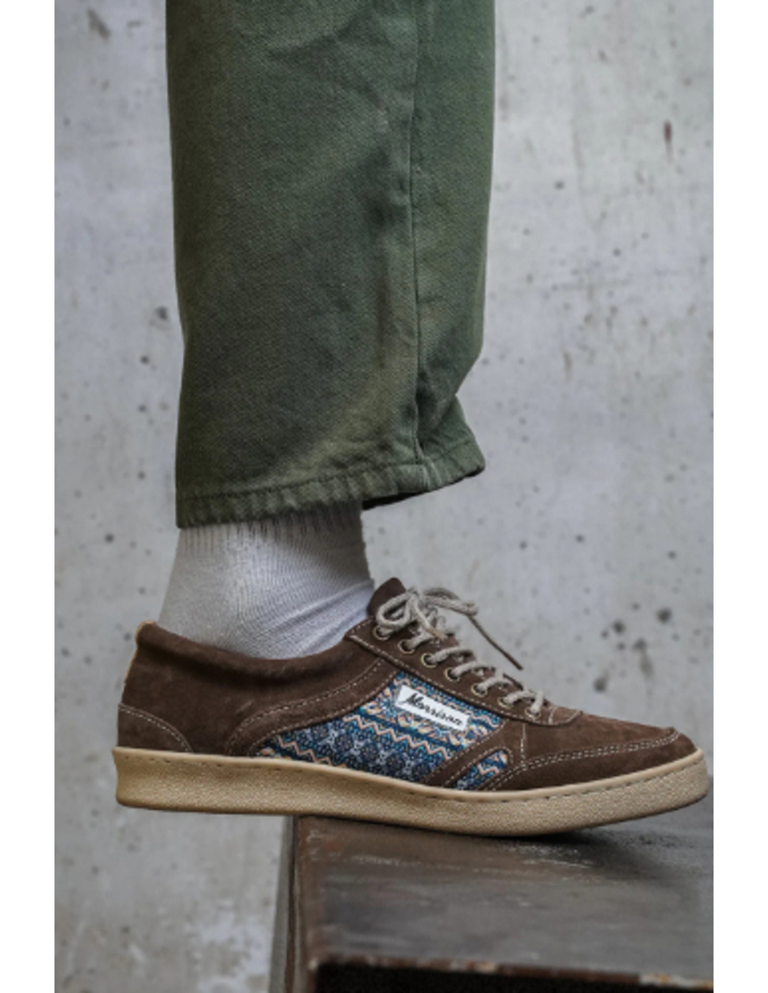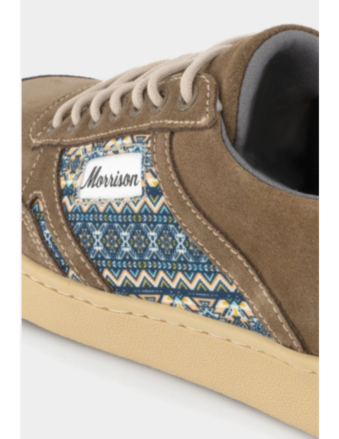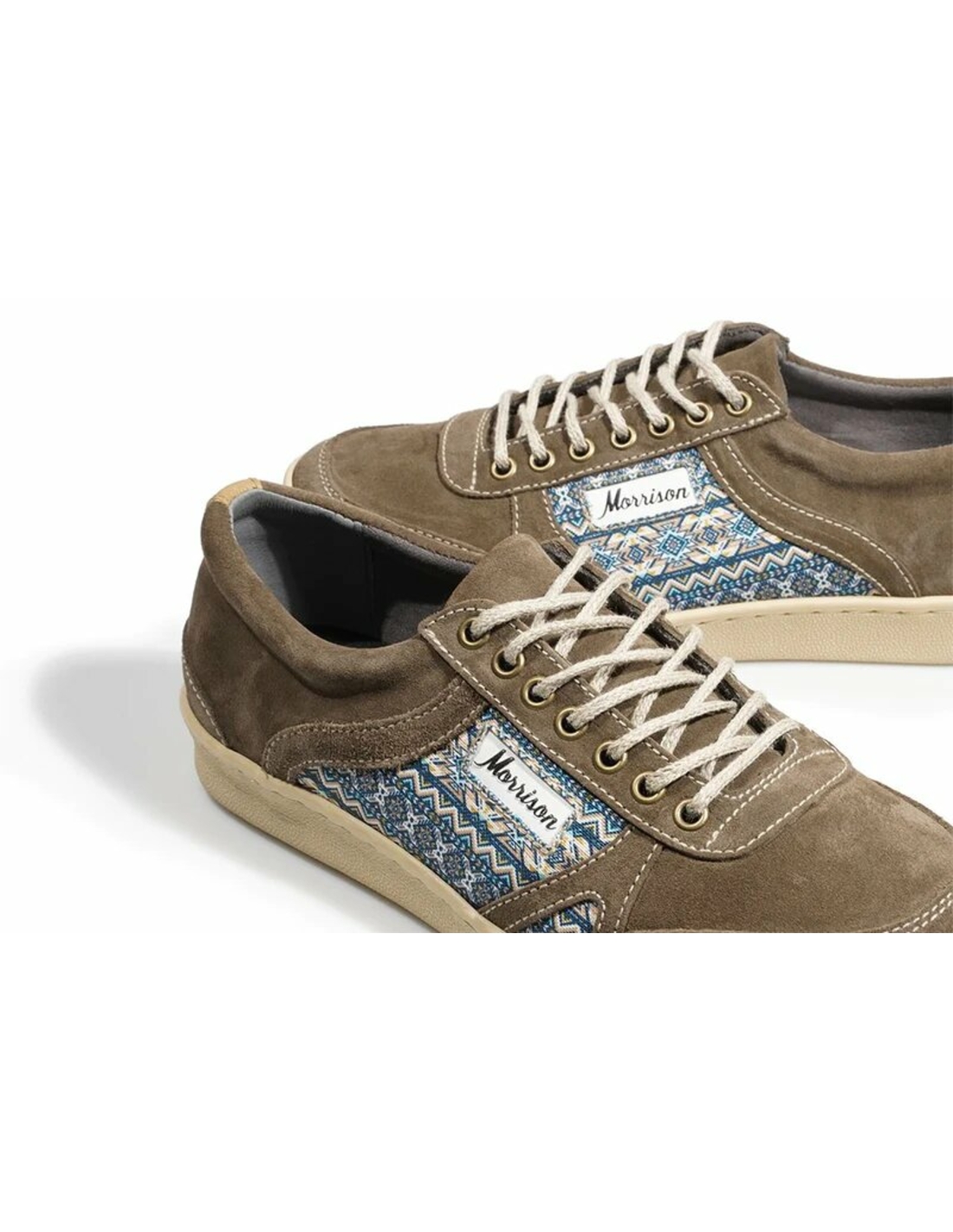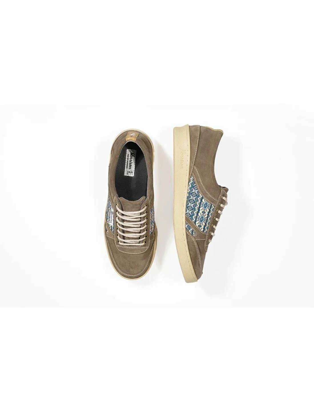 Fabricadas en serrajes color topo y costuras en hilo de color beige. Tienen un estampado de estilo tribal.